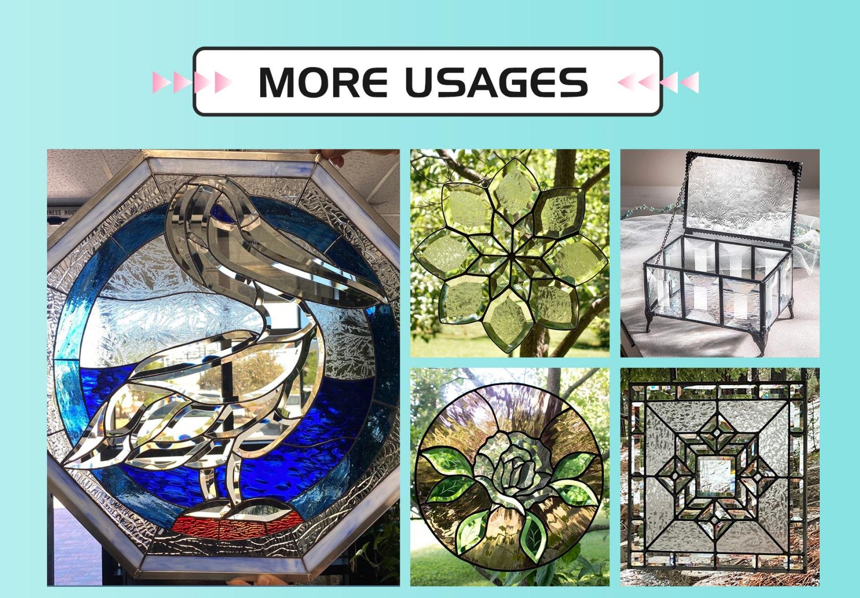 In addition to geometric shapes, our company also manufacture and sell animal bevels, artistic bevels, border bevel sets, circle bevels, glue chip bevels, colored & dichroic bevels, corner bevel clusters, engraved and etched bevels, mirror bevels, etc.